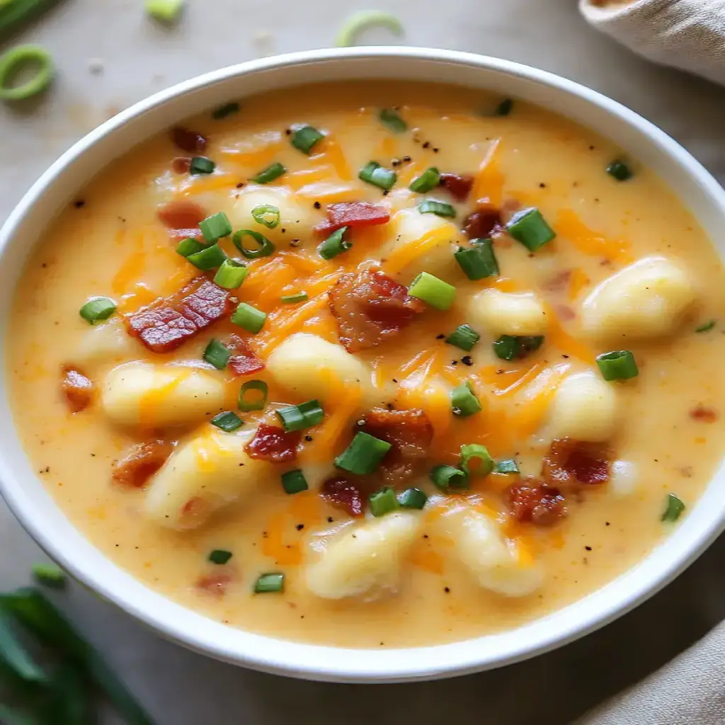 Creamy Bacon Cheddar Gnocchi Soup made with crispy bacon, fluffy potato gnocchi, and rich cheddar cheese in a velvety broth. Perfect cozy comfort food for chilly nights.
