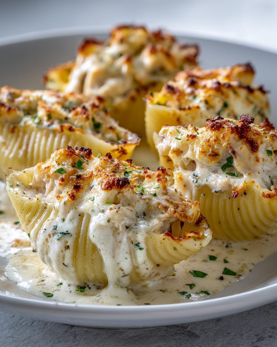 Tender jumbo pasta shells stuffed with creamy seasoned chicken and baked in rich Alfredo sauce under a perfectly melted cheese topping. A comforting and irresistible dinner.