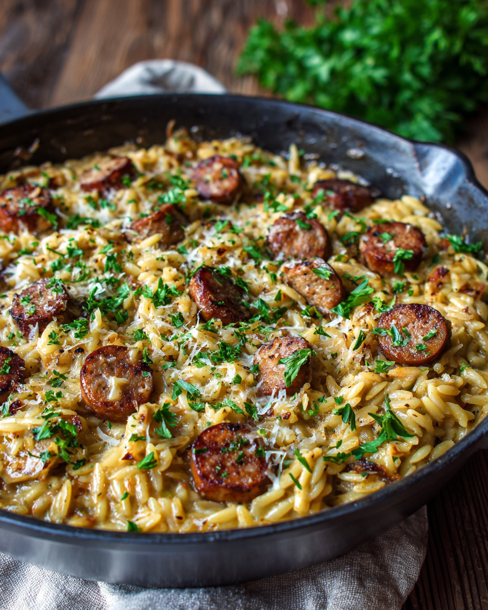 One-Pot Garlic Butter Sausage and Orzo – Creamy, Flavorful, and Irresistible