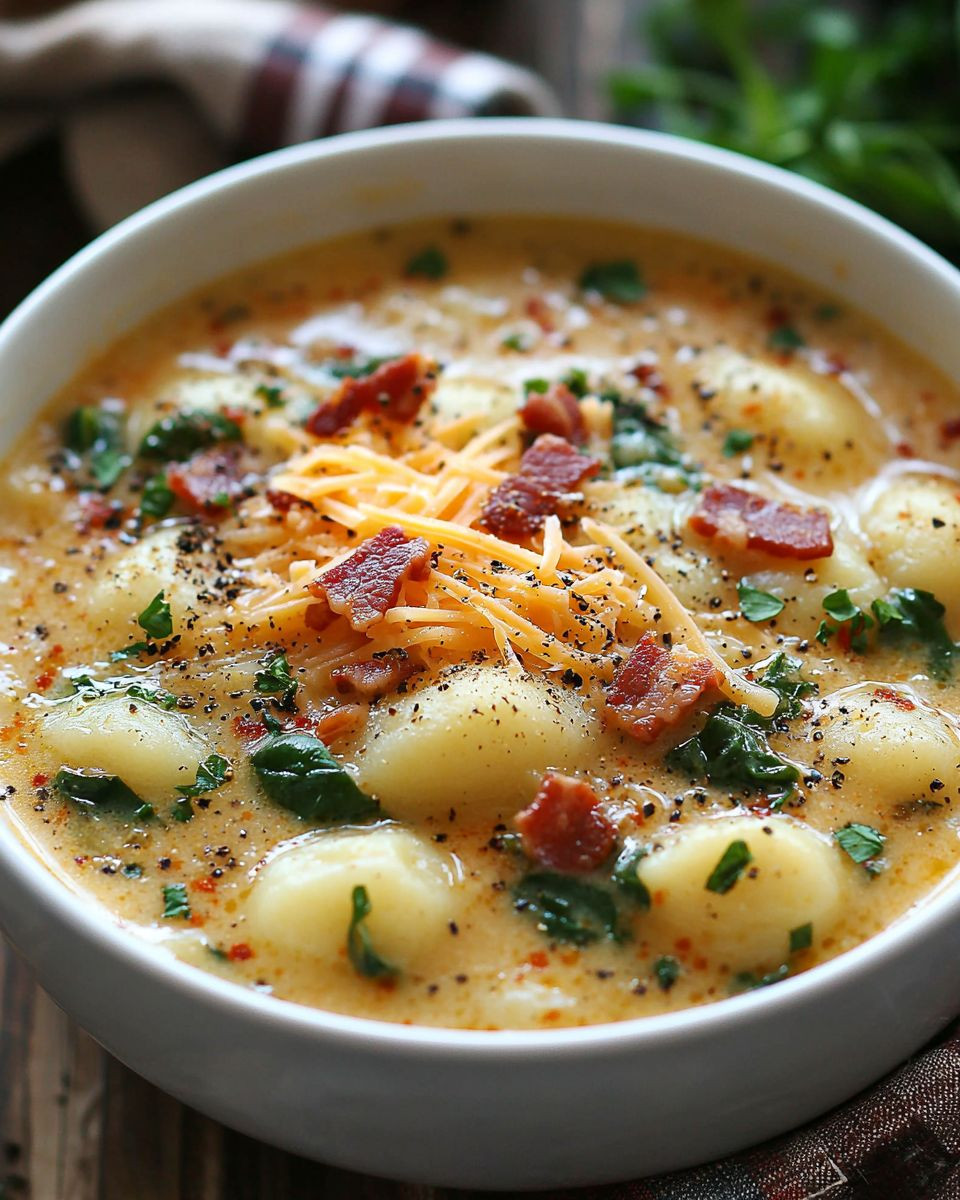 Creamy cheddar cheese, crispy bacon, and tender gnocchi in a comforting and flavorful soup.