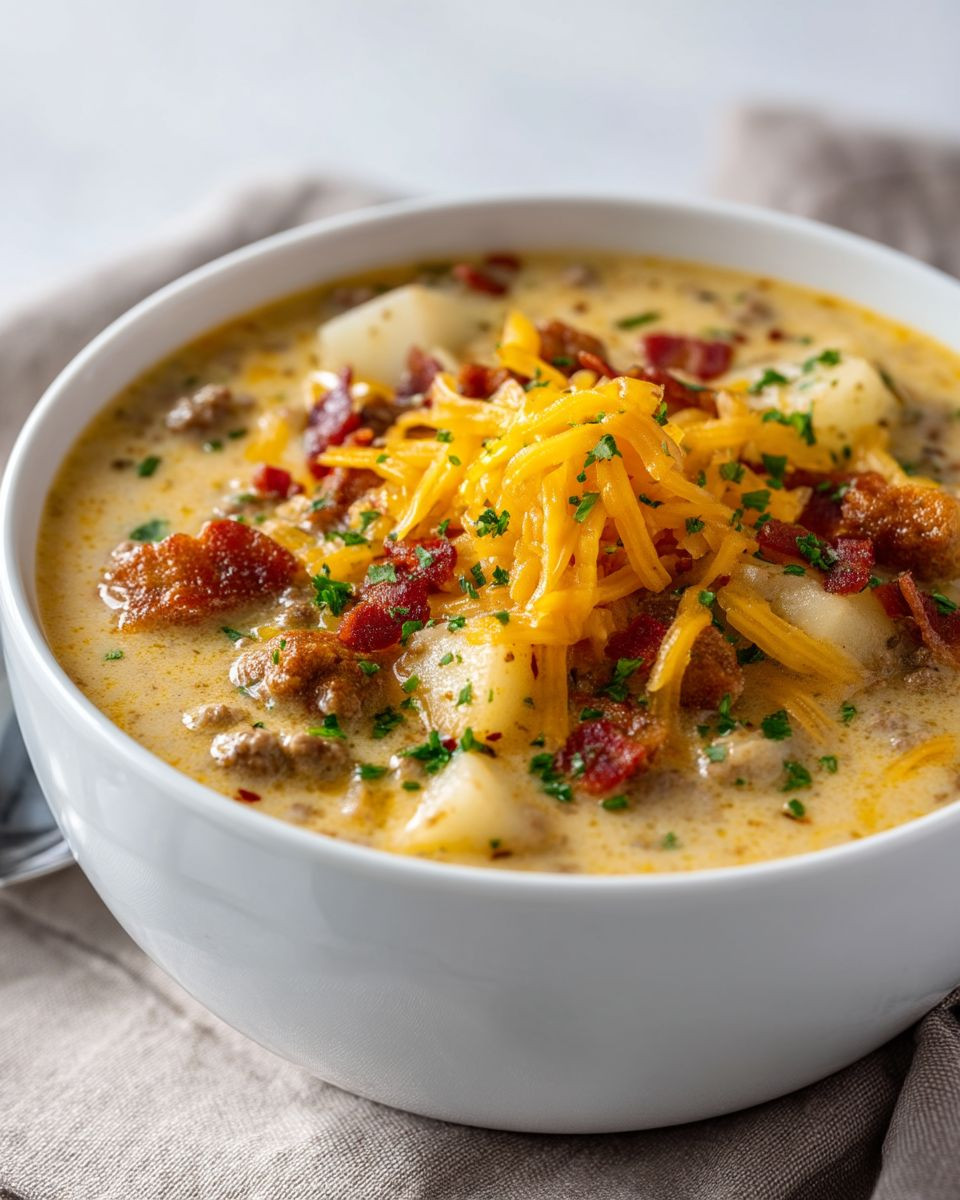 Hearty and cheesy soup tasting just like a cheeseburger! Perfect for a cozy night in.
