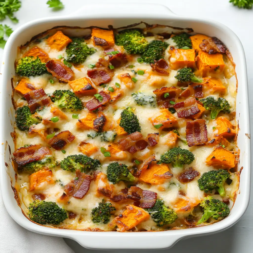 A hearty casserole made with roasted sweet potatoes, broccoli, crispy bacon, and melted cheese baked to golden perfection. Comfort food meets nutrition in this delicious family-friendly dish.