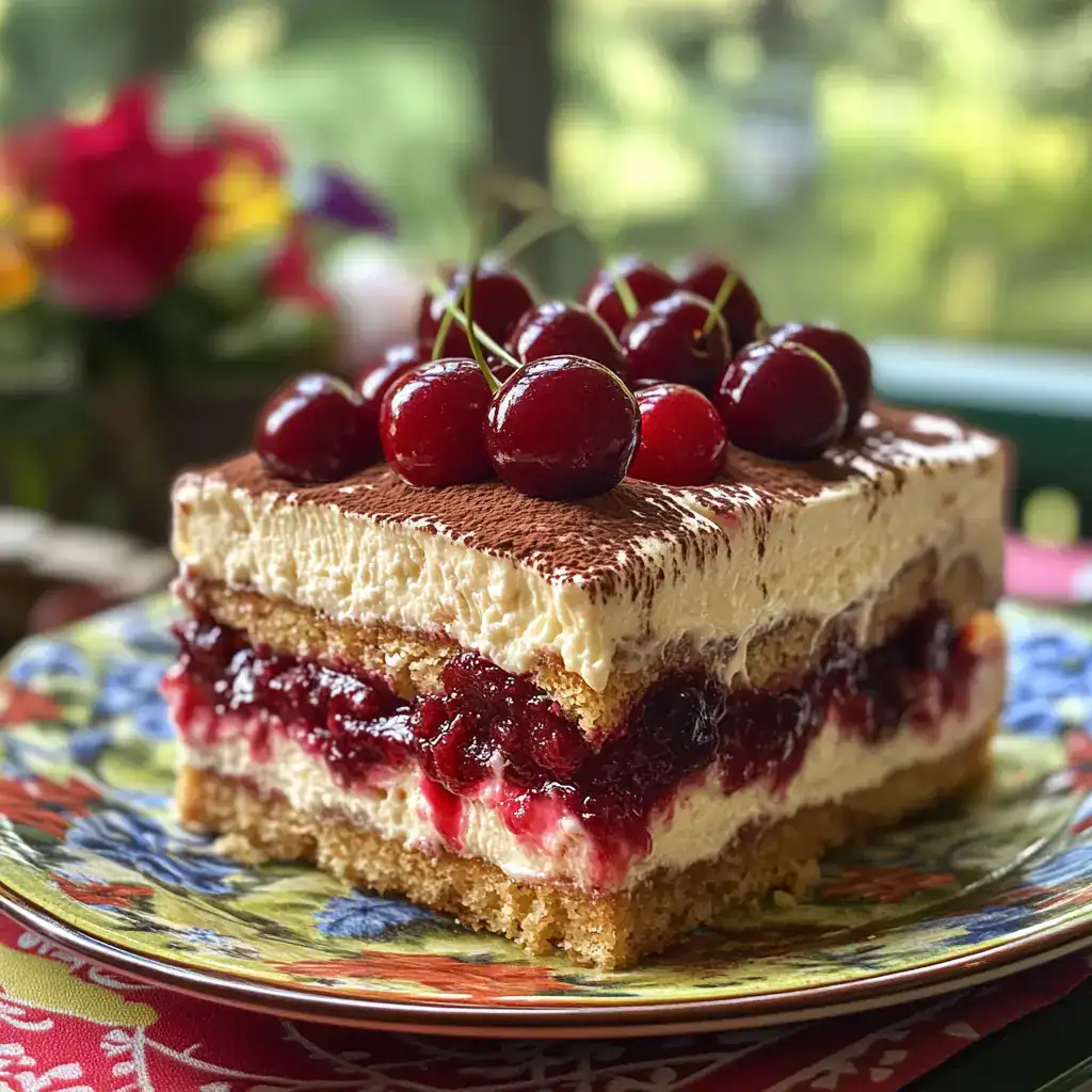 Keywords: cherry tiramisu, amaretto dessert, no-bake tiramisu, cherry mascarpone dessert, summer tiramisu, cherry layer cake