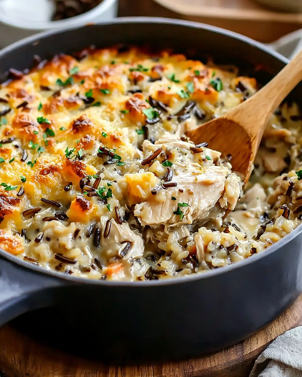 Creamy Chicken Wild Rice Casserole with tender chicken, wild rice, and vegetables in a savory sauce. Perfect for weeknights or potlucks.