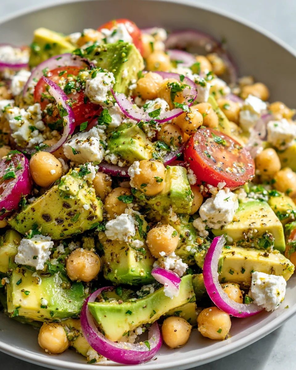 A vibrant and nutritious salad featuring creamy avocado, tangy feta, and hearty chickpeas, perfect for any meal.