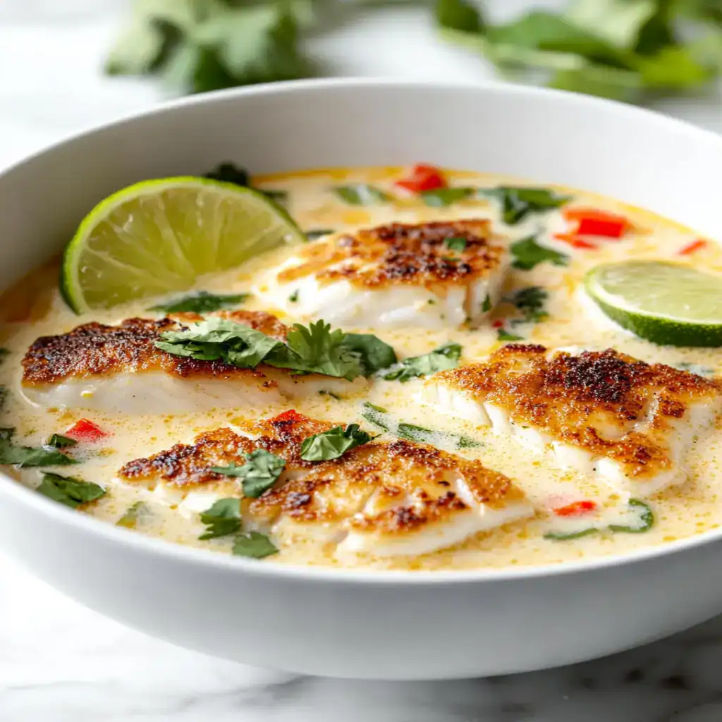 A creamy, flavorful soup made with tender seared fish in a coconut and lime-infused broth, finished with fresh herbs for a light yet satisfying meal.