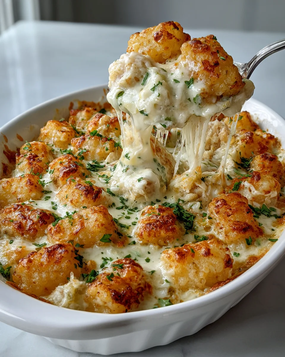 A delightful blend of tender chicken, rich Alfredo sauce, and crispy tater tots, perfect for cozy dinners.