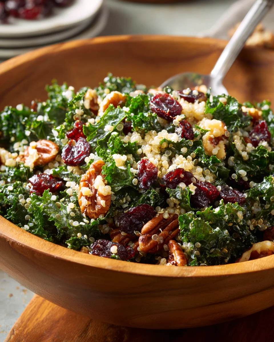 A refreshing and nutritious salad combining quinoa, kale, dried cranberries, and candied pecans, topped with a light lemon dressing.