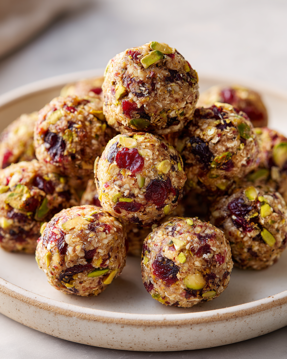 Festive no-bake bites made with pistachios, cranberries, and dates. Naturally sweet, healthy, and full of flavor, perfect for snacking or gifting.