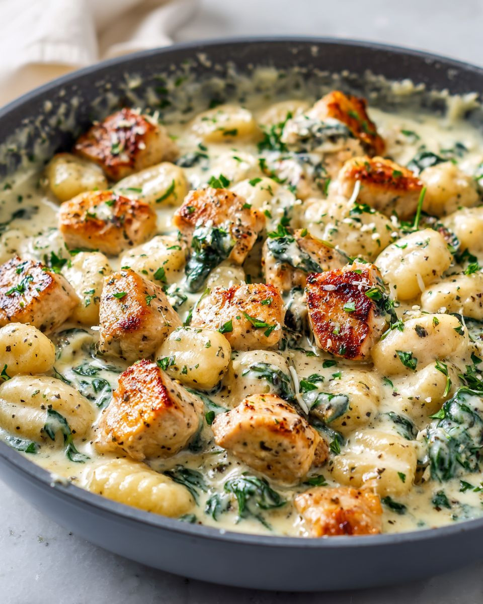 Tender chicken in a creamy garlic sauce with pillowy gnocchi. A comforting and flavorful weeknight meal.