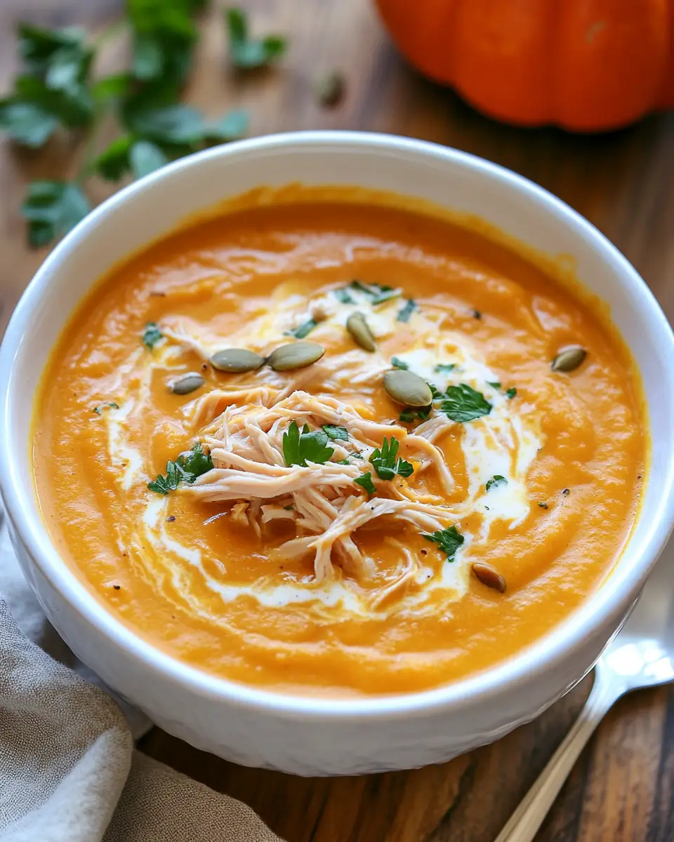 A silky smooth pumpkin soup blended with savory spices, tender shredded turkey, and a touch of cream. Topped with pumpkin seeds and fresh herbs for the perfect fall meal.