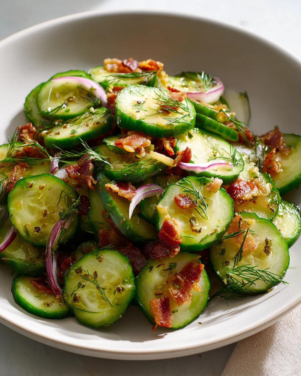 A refreshing salad featuring crisp cucumbers and savory beef bacon, perfect for summer gatherings.