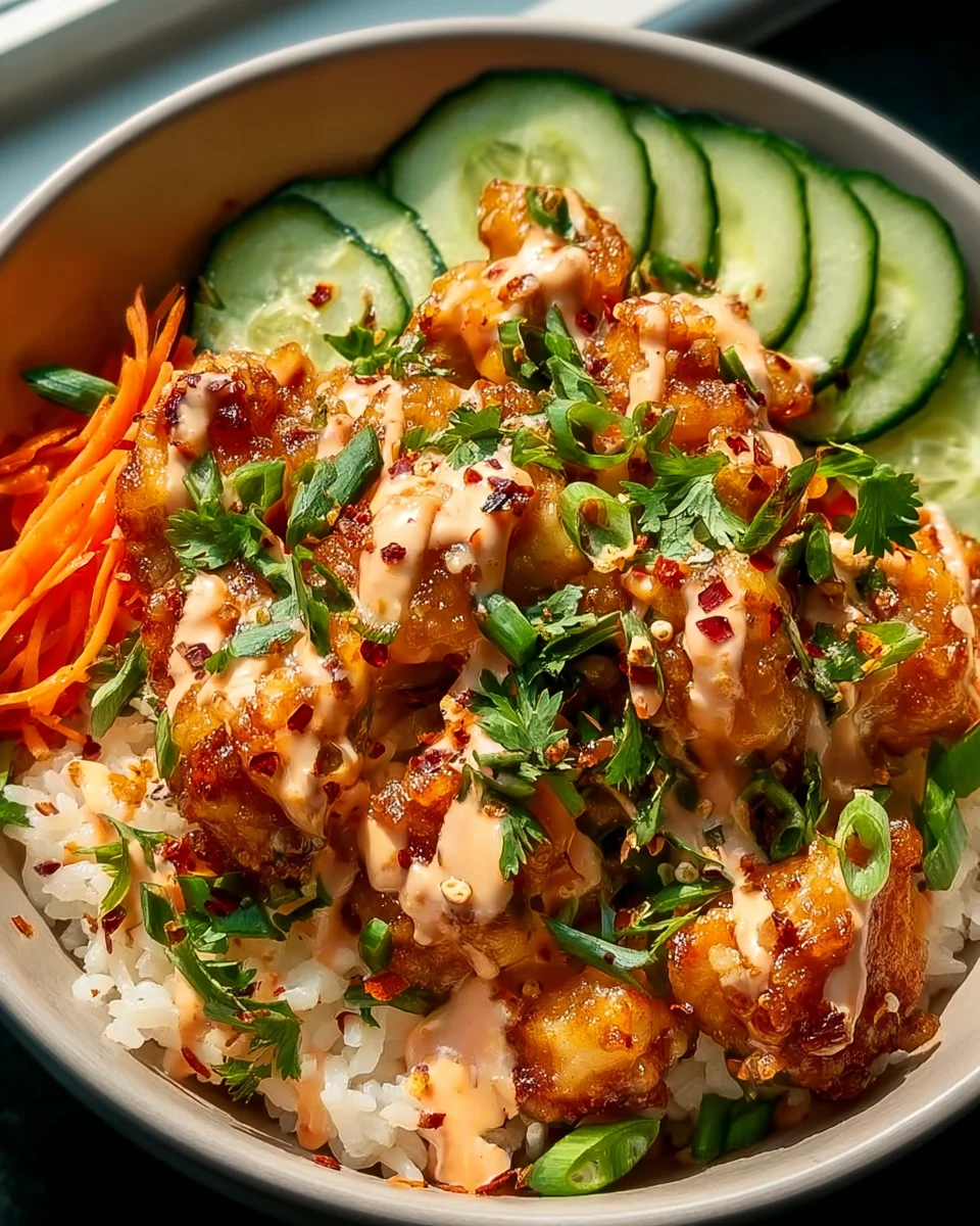 A delicious and easy-to-make Bang Bang Chicken Bowl featuring crispy chicken, fresh veggies, and a creamy, spicy sauce.