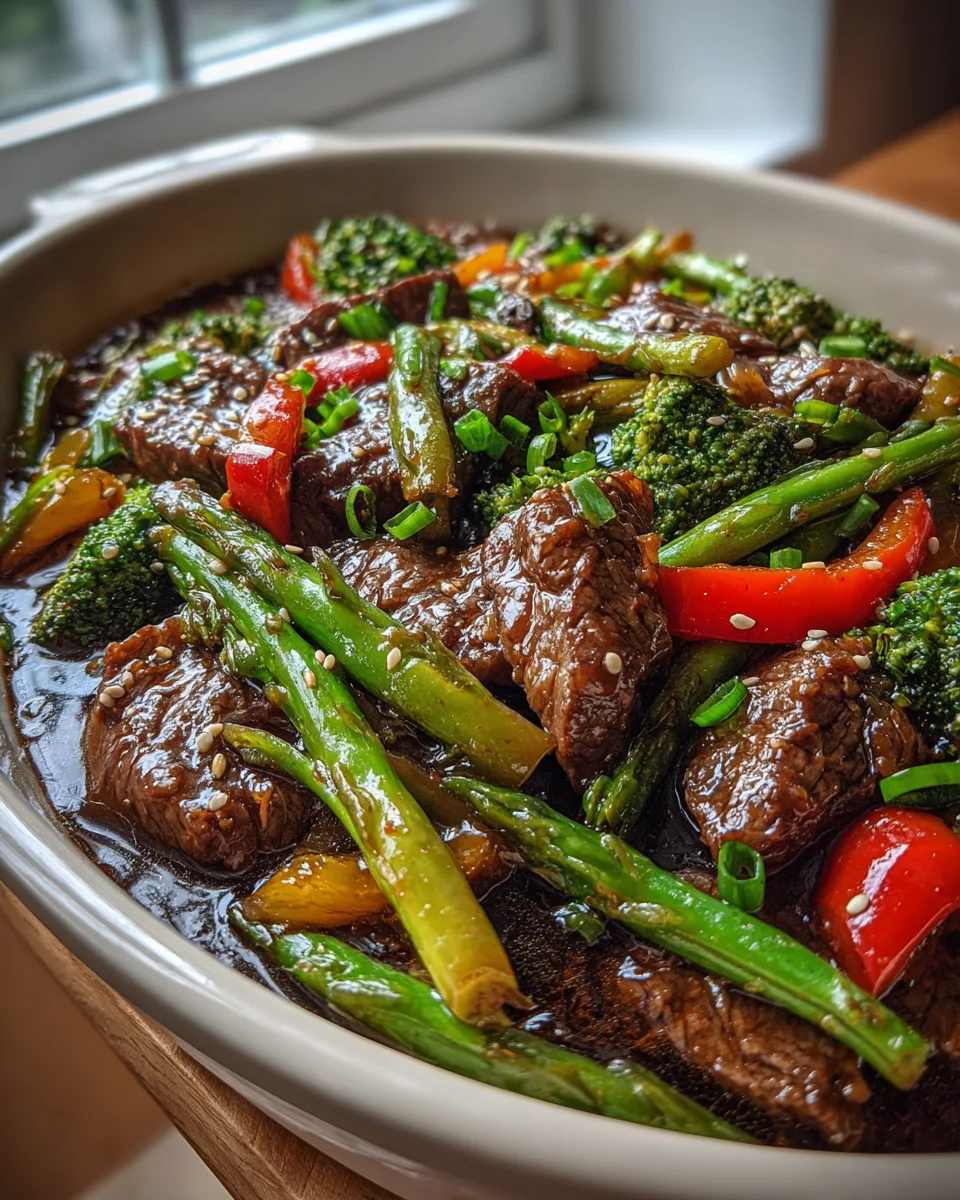 A quick and delicious beef stir fry packed with vibrant vegetables and rich flavors, perfect for any weeknight dinner.