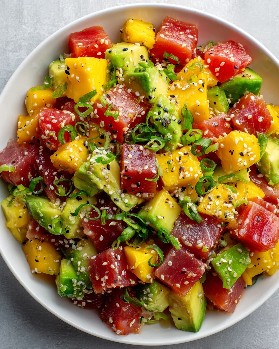 A refreshing twist on traditional poke, this salad combines fresh greens, colorful vegetables, and savory tuna for a delightful meal.