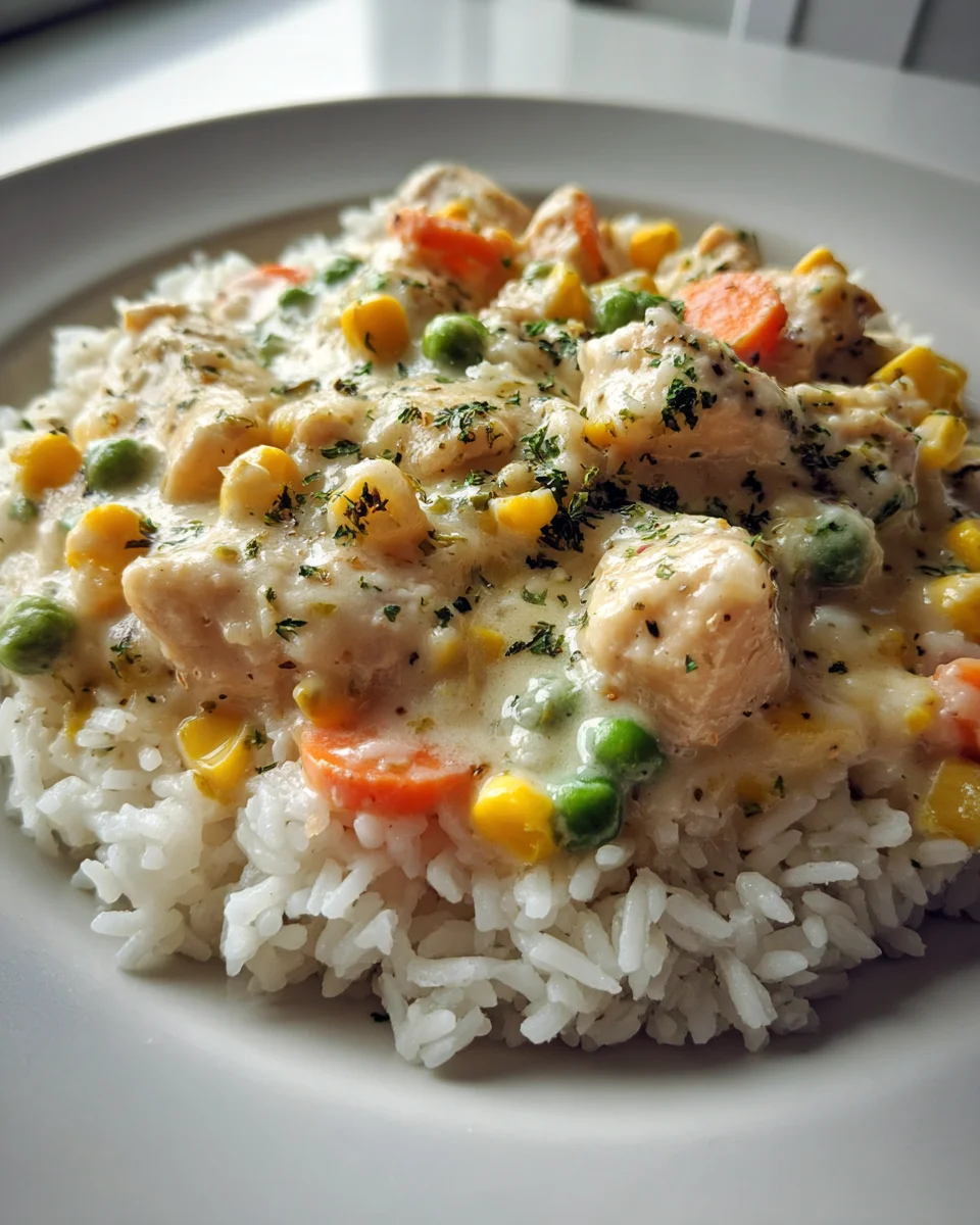 A comforting and hearty casserole featuring chicken and vegetables in a creamy sauce, without the fuss of a crust.