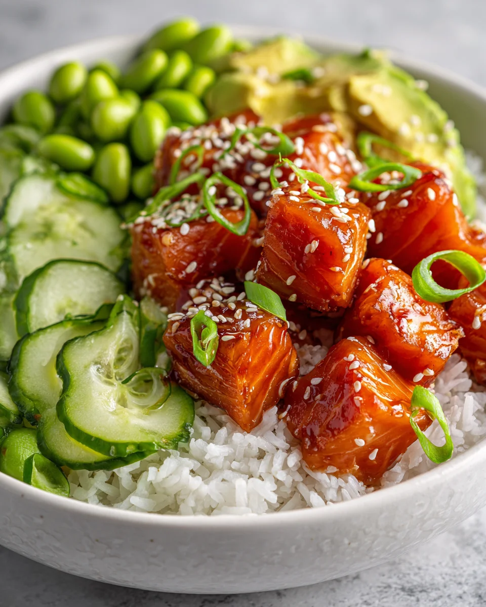 Assemble bowls with rice, salmon, avocado slices, cucumber, edamame, and drizzle with sriracha mayo.