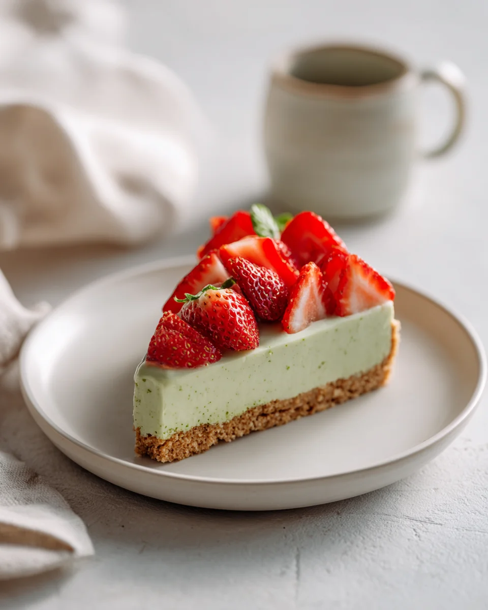 - Garnish and Serve: Once set, remove the sides of the springform pan. Decorate the top with remaining strawberries and crushed pistachios. Slice with a sharp knife dipped in hot water for clean cuts.