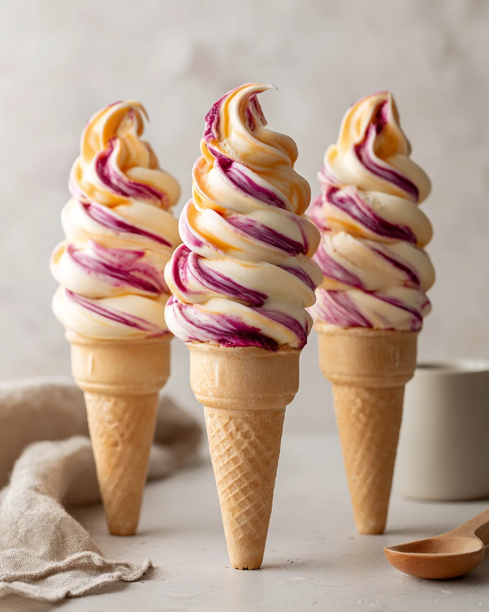 - Serve in Cones: Once the ice cream is set, scoop it into your chosen cones. You can add a few fresh raspberries or peach slices on top for a lovely presentation.
