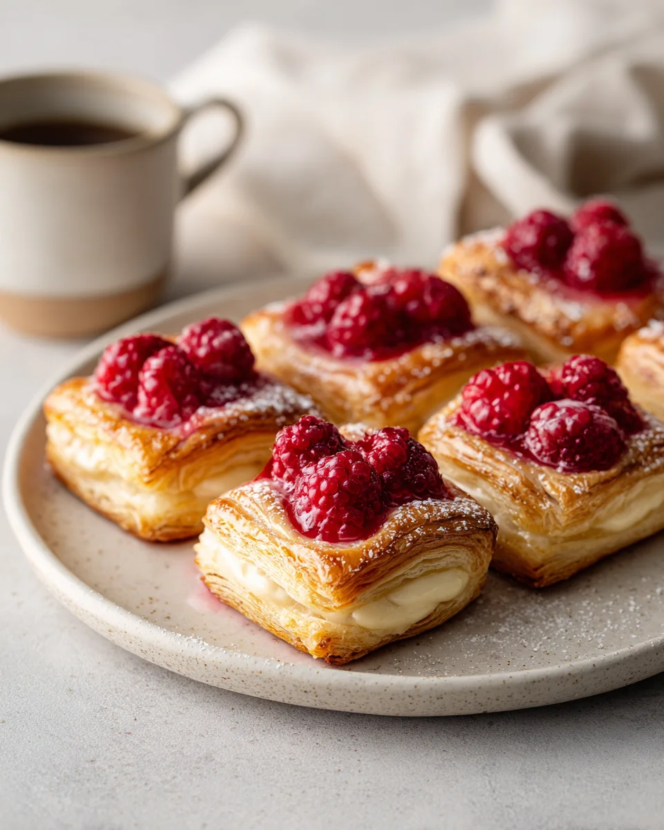 - Assemble the Danishes: In the center of each puff pastry rectangle, add a generous spoonful of the cream cheese mixture. Top it with a few fresh raspberries, pressing them slightly into the mixture.