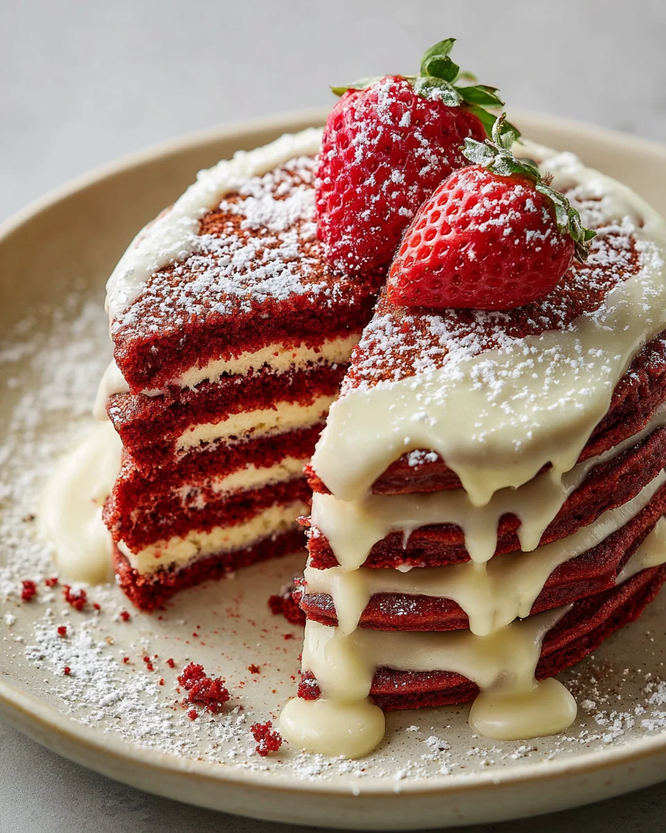 To complement your red velvet pancakes, consider serving them with a side of fresh fruit salad, crispy bacon, or sausage links. For drinks, a glass of fresh orange juice or a sweet strawberry smoothie pairs beautifully.