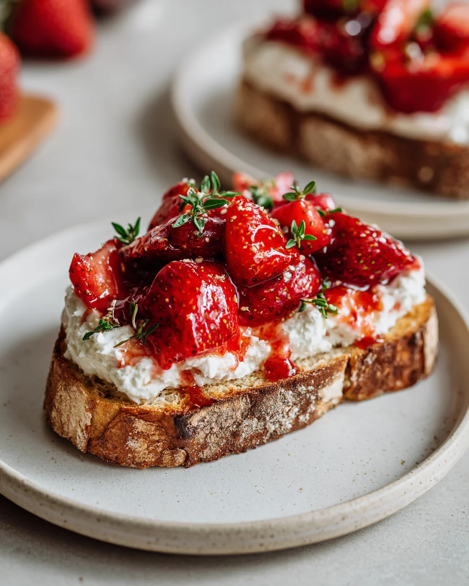 A delightful toast featuring roasted strawberries, creamy whipped ricotta, and crunchy rustic bread, perfect for breakfast or brunch.