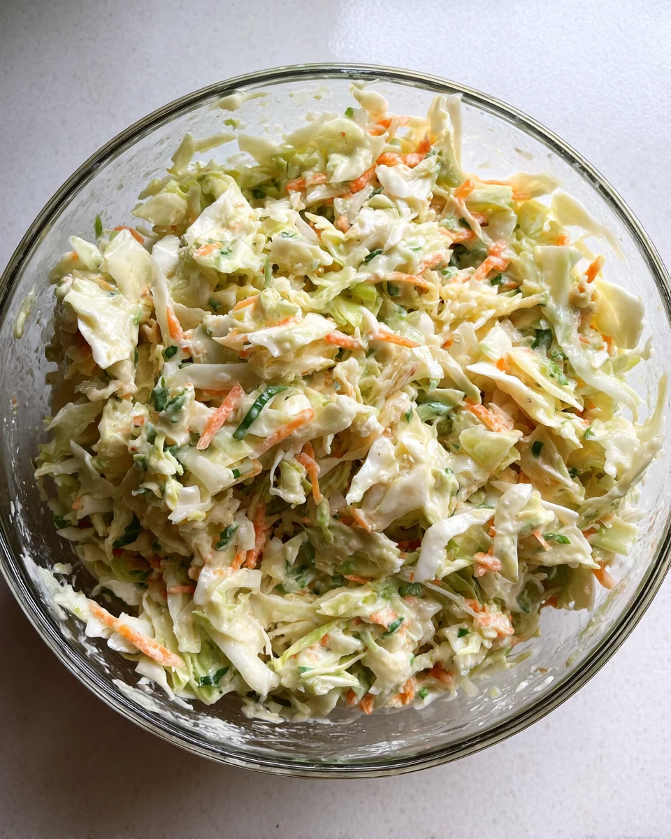 Pour the dressing over the salad mixture and toss thoroughly to ensure that all the vegetables are evenly coated. The cabbage should glisten lightly from the dressing, and the colors of the vegetables will pop.