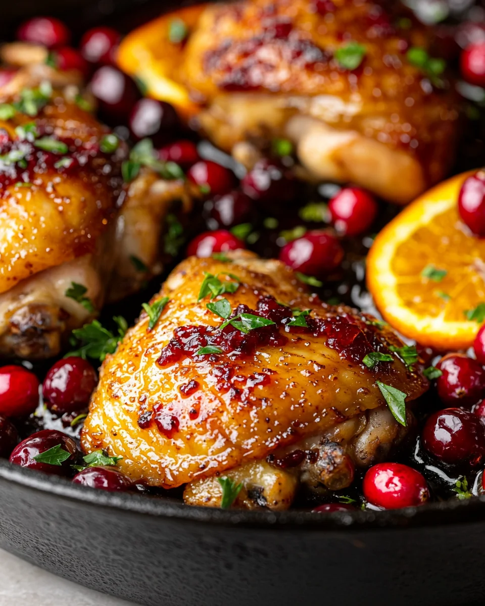 Serve: While chicken rests, prepare the pan sauce. Stir any remaining reserved sauce into the baking dish with pan drippings, scraping up any flavorful browned bits. If desired, transfer to a small saucepan and simmer to thicken further with a cornstarch slurry (if needed). Taste and adjust seasonings. Transfer chicken to a serving platter, drizzle generously with the pan sauce, and garnish with fresh chopped parsley/thyme, orange slices, and fresh cranberries. Serve hot with desired sides.