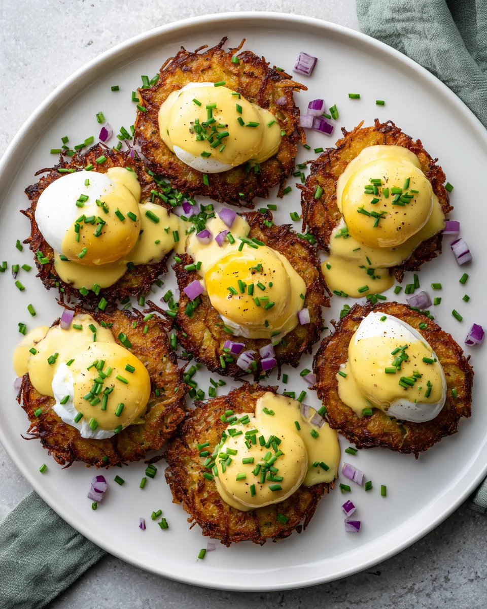 A delightful twist on a classic brunch favorite featuring crispy latkes topped with poached eggs and hollandaise sauce.