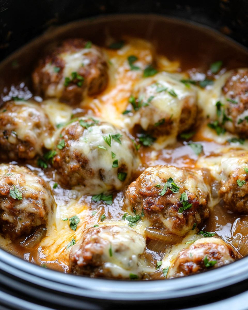 - Serve the French Onion Meatballs hot, spooning the rich sauce over them. Garnish with fresh parsley for a pop of color and freshness.