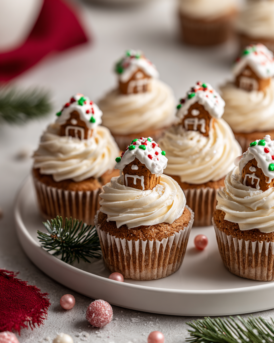 Soft and spiced gingerbread cupcakes topped with creamy vanilla buttercream and a mini gingerbread house cookie perfect for holiday parties and cookie trays.