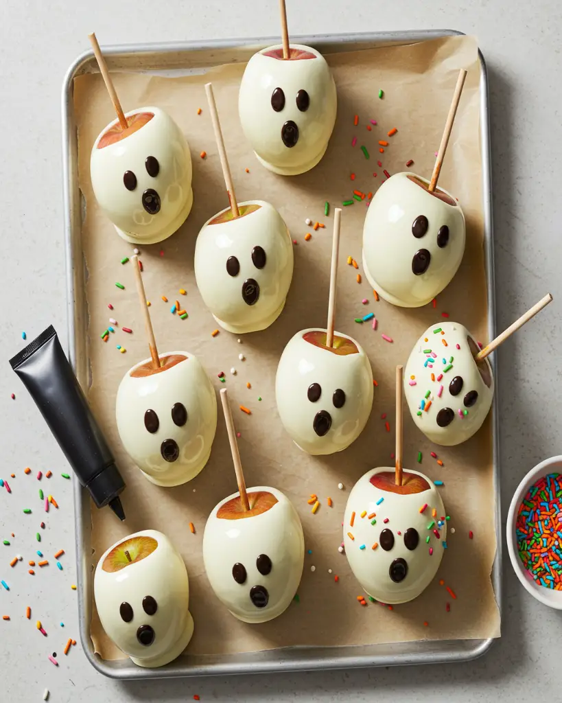 Spooky white chocolate-covered apples decorated with ghost faces and sprinkles that glow under blacklight. Perfect for Halloween parties and kid-friendly fun.