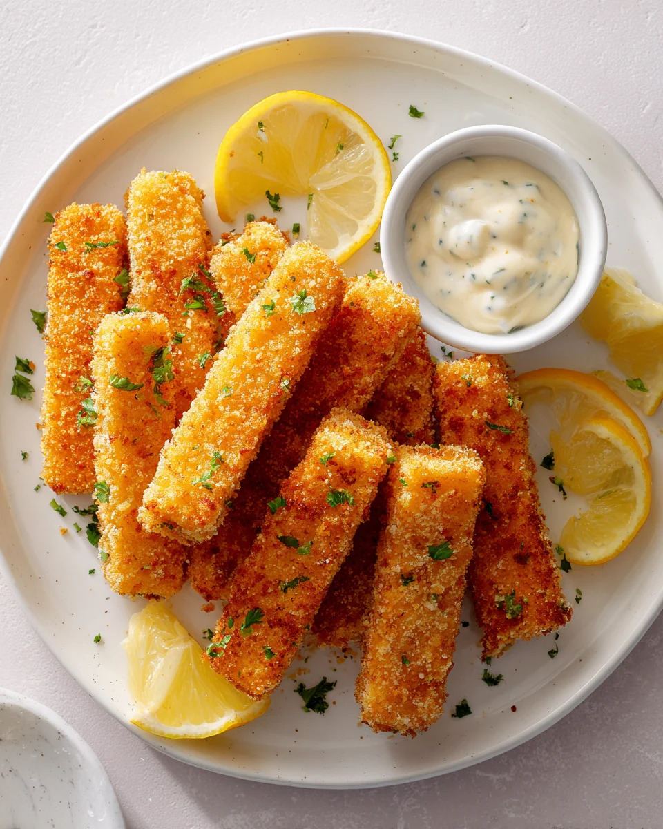 For extra crispiness, lightly drizzle or spray a tiny bit of olive oil over the top of the breaded fish sticks. Transfer to the preheated oven and bake for 12-18 minutes, or until the fish is cooked through, flaky, and the breading is a beautiful golden brown and wonderfully crispy. Flip each fish stick halfway through baking (around 6-9 minutes). The internal temperature of the fish should reach 145°F (63°C). Serve hot, straight from the oven, with lemon wedges. -