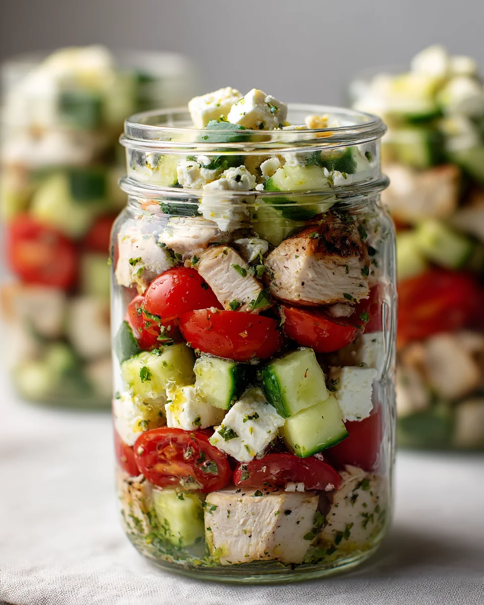 Enjoy a vibrant Greek Chicken Salad in a Jar with Zesty Lemon Dressing, perfect for any meal of the day. This delightful dish combines juicy chicken, crisp vegetables, and a tangy dressing for a refreshing experience.