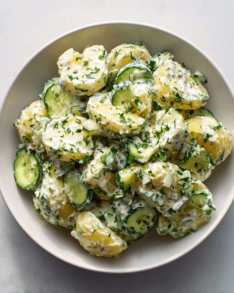 A light and creamy potato salad made with Greek yogurt, fresh cucumbers, and dill. Refreshing, tangy, and perfect for any occasion.