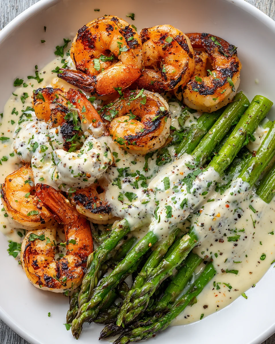 The Grilled Shrimp Bowl With Asparagus Creamy Garlic Sauce is a delightful fusion of succulent grilled shrimp served atop a bed of fluffy rice or quinoa, generously drizzled with a creamy sauce made from fresh asparagus and aromatic garlic. The dish boasts a beautiful contrast of textures—the tender shrimp pairs wonderfully with the smooth, luscious sauce and the hearty grains or greens underneath. Unlike typical shrimp dishes, the creamy asparagus sauce adds a unique twist, elevating this bowl to a comforting yet sophisticated meal. It’s reminiscent of a classic pasta dish but offers a lighter, healthier alternative that’s just as satisfying.