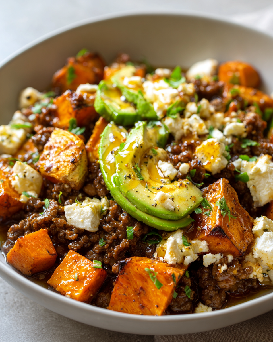 - Assemble the Bowls: Divide roasted sweet potatoes, seasoned beef, and avocado slices between serving bowls. Sprinkle feta on top.