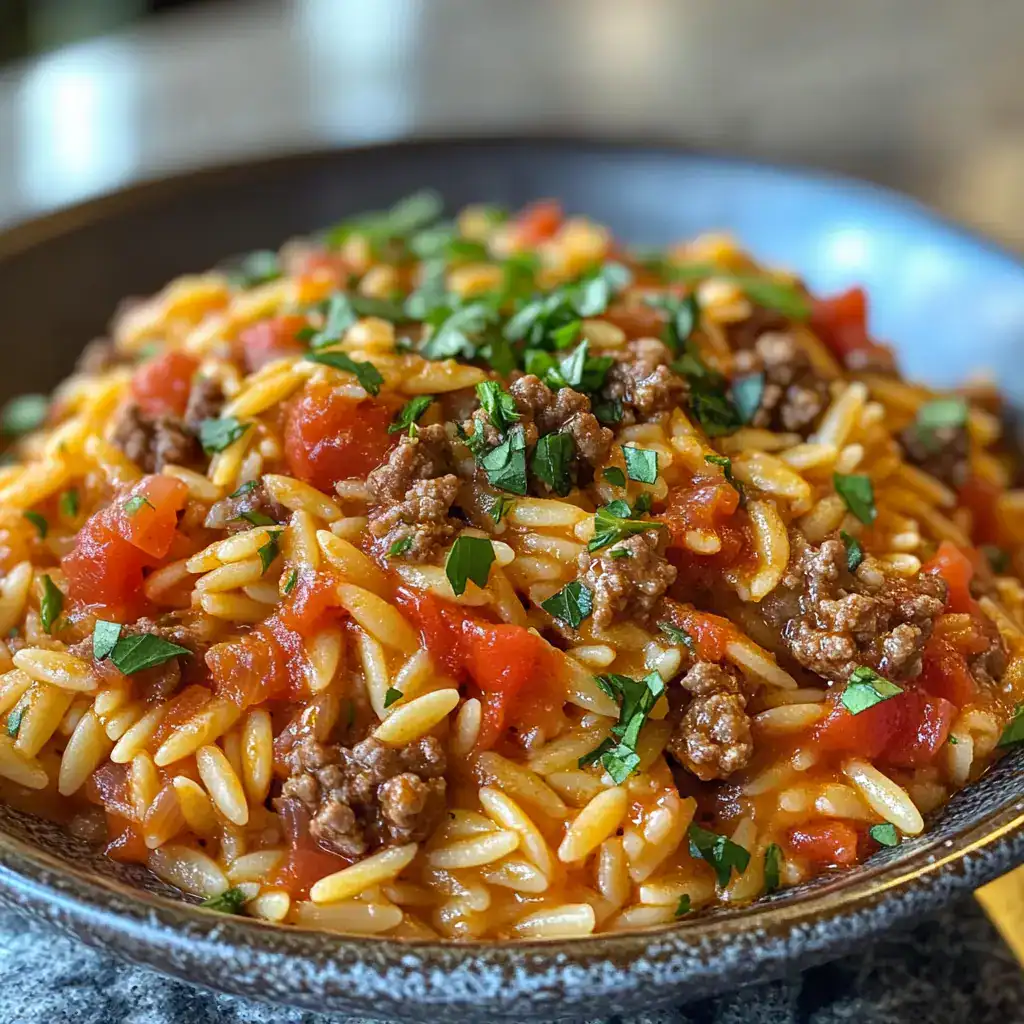 This Ground Beef Orzo is savory, slightly tangy from the tomatoes, and loaded with the tender texture of orzo pasta that’s been simmered right in the sauce. The ground beef gives it a rich, hearty bite, while fresh parsley or basil on top adds a pop of freshness. It’s simple but incredibly satisfying—comfort food without the fuss.