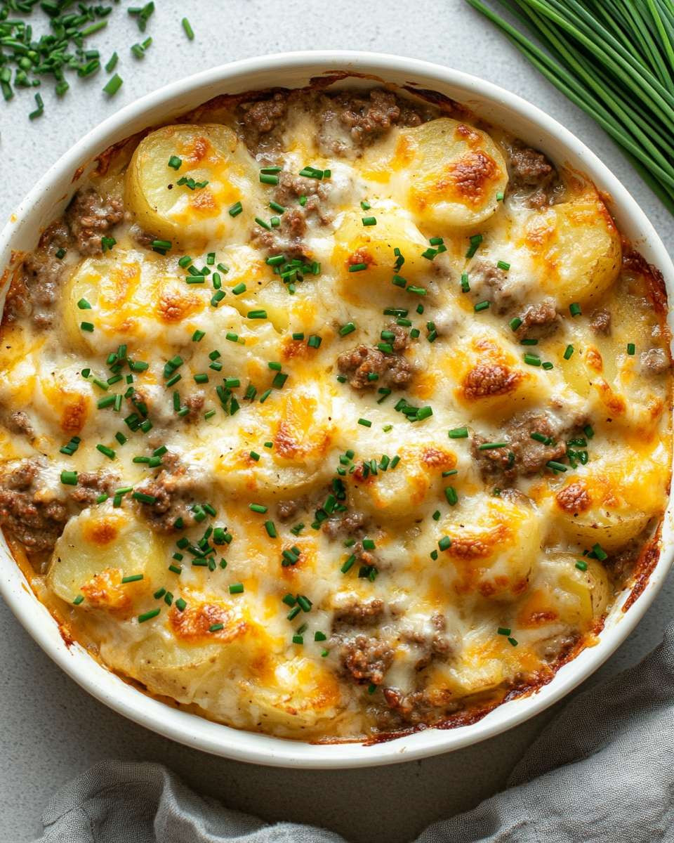 Hearty casserole with layers of tender potatoes and savory beef, topped with melted cheese.