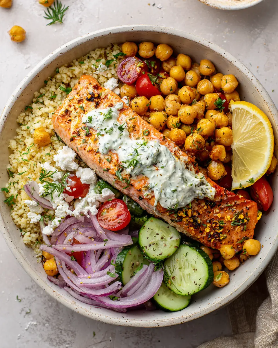 A Mediterranean-inspired bowl with salmon, crispy chickpeas, couscous, fresh vegetables, and a creamy dill yogurt sauce. A healthy, flavorful, and balanced meal.