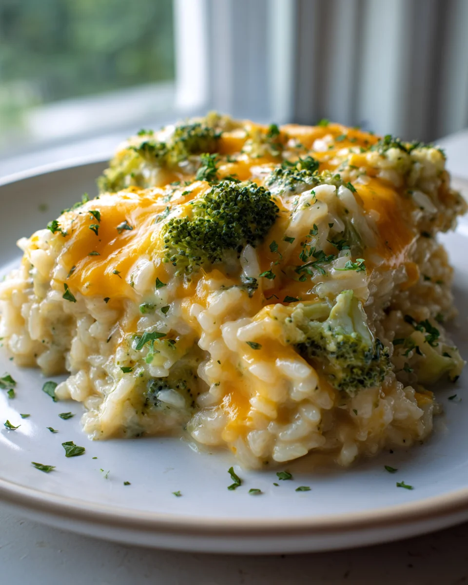 This inviting casserole brings together tender broccoli florets and fluffy rice in a creamy, cheesy sauce, baked to golden perfection. A comforting and satisfying dish perfect for any family meal.