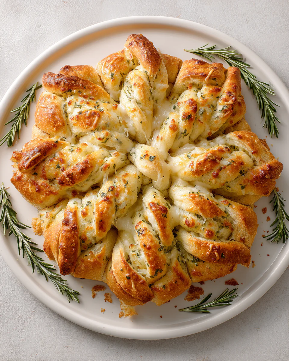 Soft layers of dough are spread with garlicky herb butter and melty cheese, twisted into an elegant snowflake pattern that bakes into a fluffy, golden masterpiece. It’s cozy, crowd-pleasing, and guaranteed to impress everyone at your next holiday gathering.