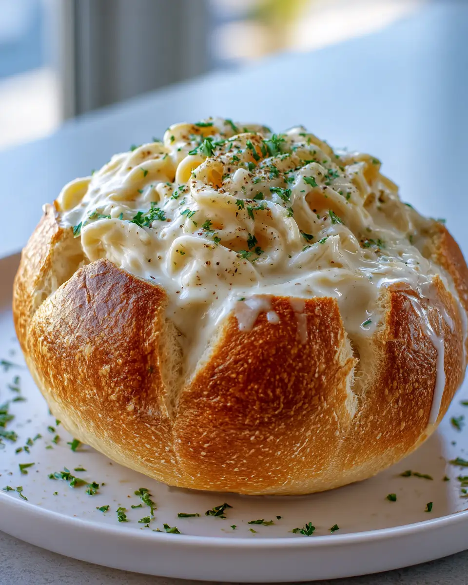 A creamy, high-protein Alfredo pasta made with cottage cheese and Parmesan, served in crusty bread bowls for a comforting but nutritious twist on a classic dish.
