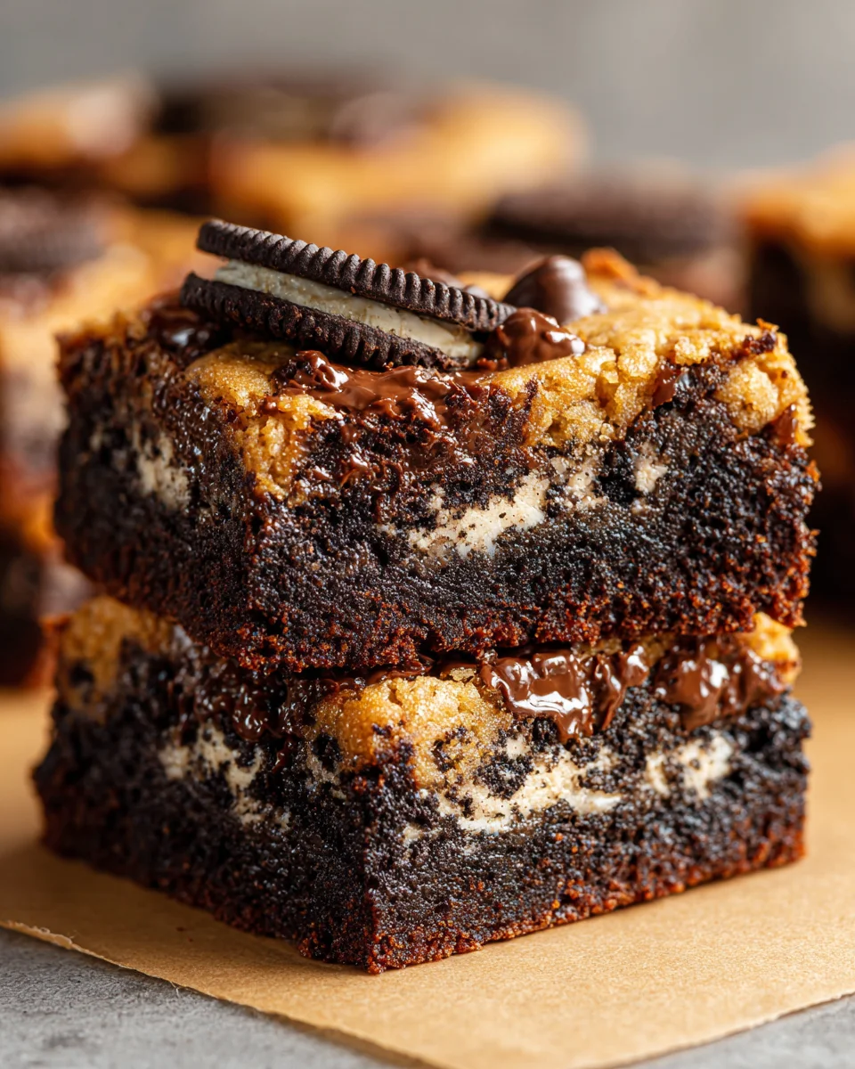 A delicious fusion of rich brownie batter and creamy cookie dough, layered with Oreo cookies for an indulgent treat.