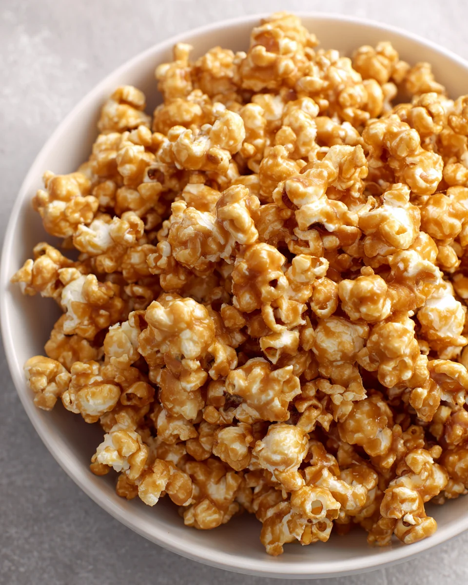 - Working quickly, pour the hot caramel sauce evenly over the popped popcorn in your extra-large mixing bowl. Make sure to scrape every last bit of that precious caramel from the saucepan!