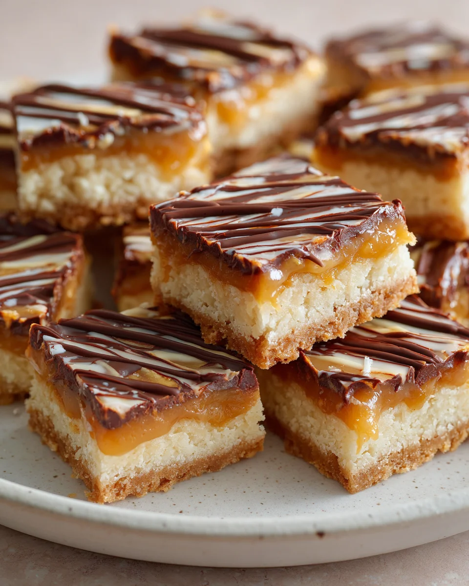 A delightful low-carb twist on the classic Samoa cookie, combining toasted coconut, rich chocolate, and creamy caramel for a guilt-free indulgence.