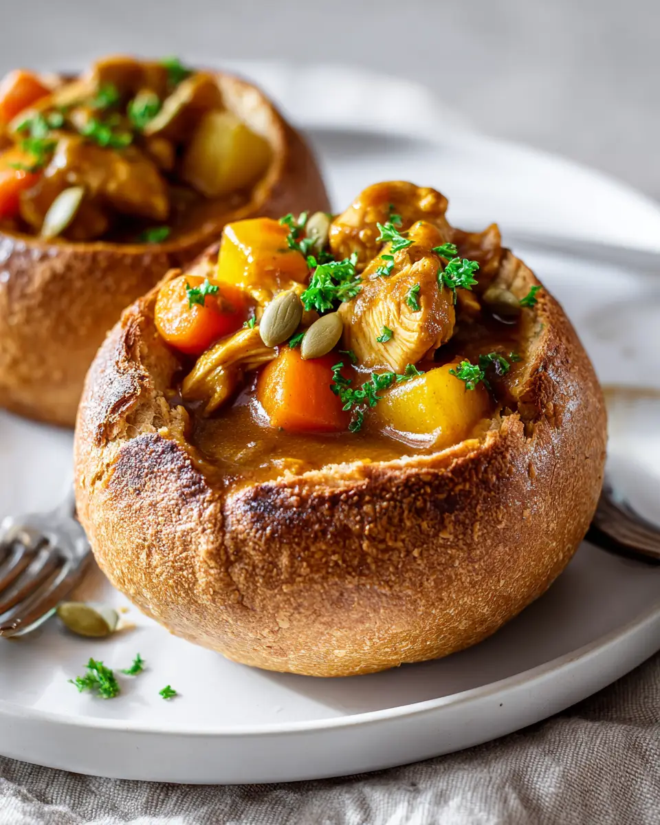 The bread bowl adds a new dimension: the inside becomes soft and curry-soaked, while the crust stays firm, giving you a contrast of chewy and crunchy textures. Topped with pumpkin seeds and fresh herbs, every bite feels like autumn comfort perfected.