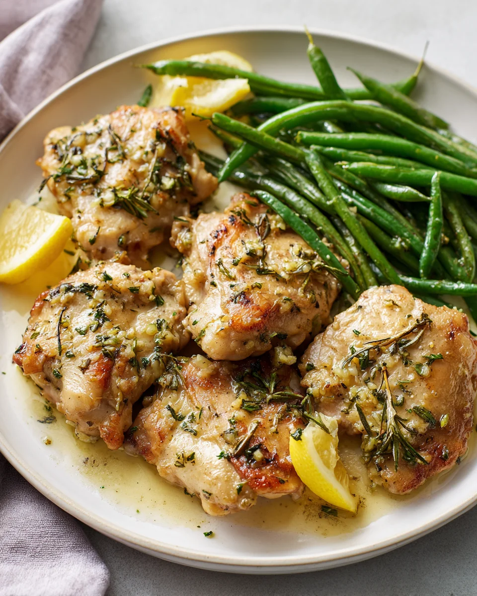 A weeknight wonder featuring succulent chicken thighs with crispy skin and tender-crisp green beans, all cooked in a vibrant lemon-garlic butter sauce in a single pan. This dish offers incredible flavor, minimal effort, and super easy cleanup, making it a beloved staple for a satisfying and healthy dinner.