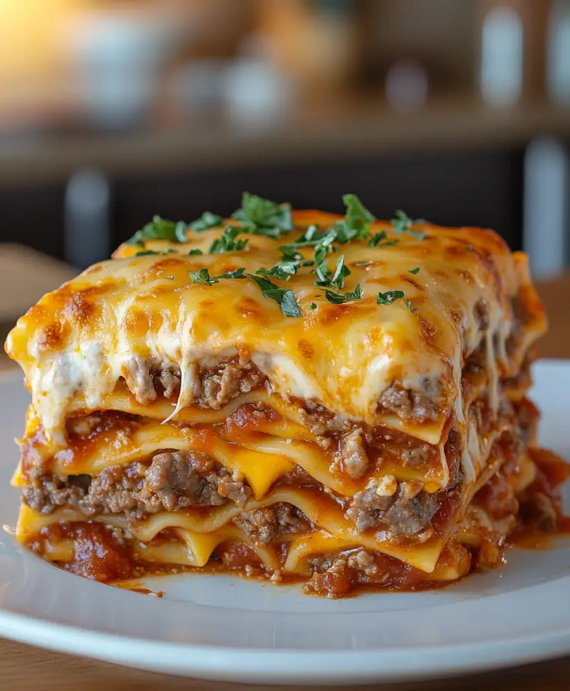This recipe layers the saucy beef-and-cheddar flavors of a cheeseburger with the structure and gooeyness of lasagna. Think juicy ground beef simmered in a tangy sauce, golden melted cheese stretching with every bite, and tender lasagna noodles tying it all together. It’s the kind of recipe that makes family dinners extra special, potlucks a hit, and leftovers absolutely irresistible.