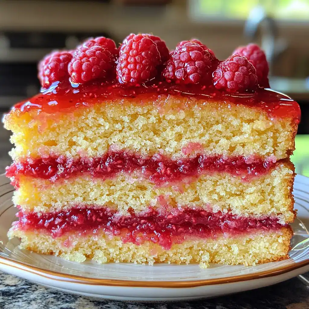 A soft and zesty lemon sponge cake layered with smooth lemon curd and raspberry jam, topped with a vibrant raspberry drizzle and fresh berries. An easy yet impressive dessert for brunch, birthdays, or special occasions.